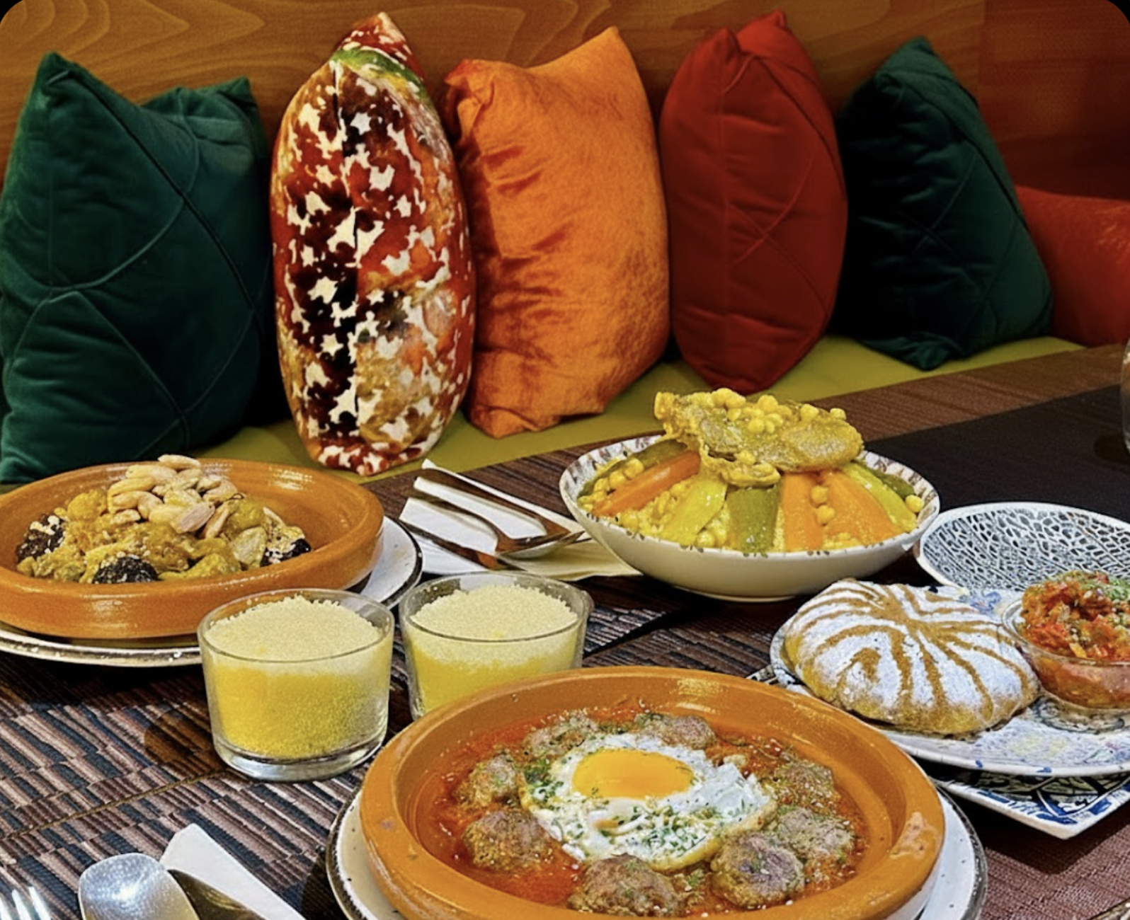 Tajines slow-cooked with spices, couscous with seasonal vegetables, harira soup, briouates, and traditional pastries.